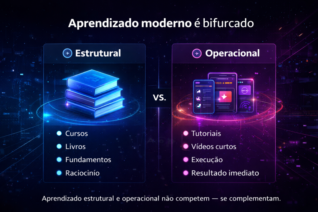 Aprendizado operacional — como executar uma tarefa específica, agora, com a ferramenta que você tem na tela. Esse trilho é dominado pelos tutoriais.