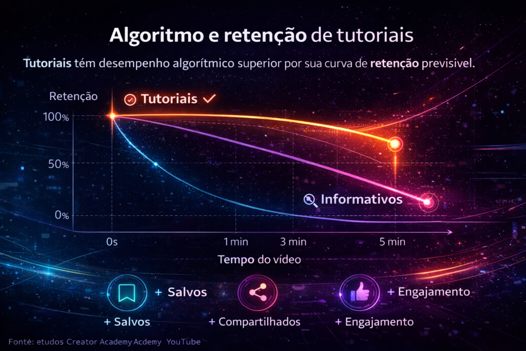 YouTube, TikTok e Google Discover favorecem tutoriais por um motivo mais técnico do que “conteúdo útil”. A razão é que tutoriais têm curvas de retenção previsíveis.