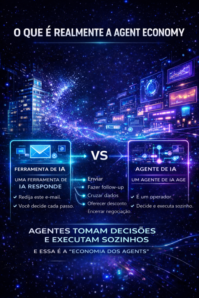 A expressão “agent economy” corre o risco de ser absorvida pelo vocabulário corporativo sem ser compreendida. Vale estabelecer a distinção com precisão cirúrgica, porque ela é o fundamento de tudo que segue.