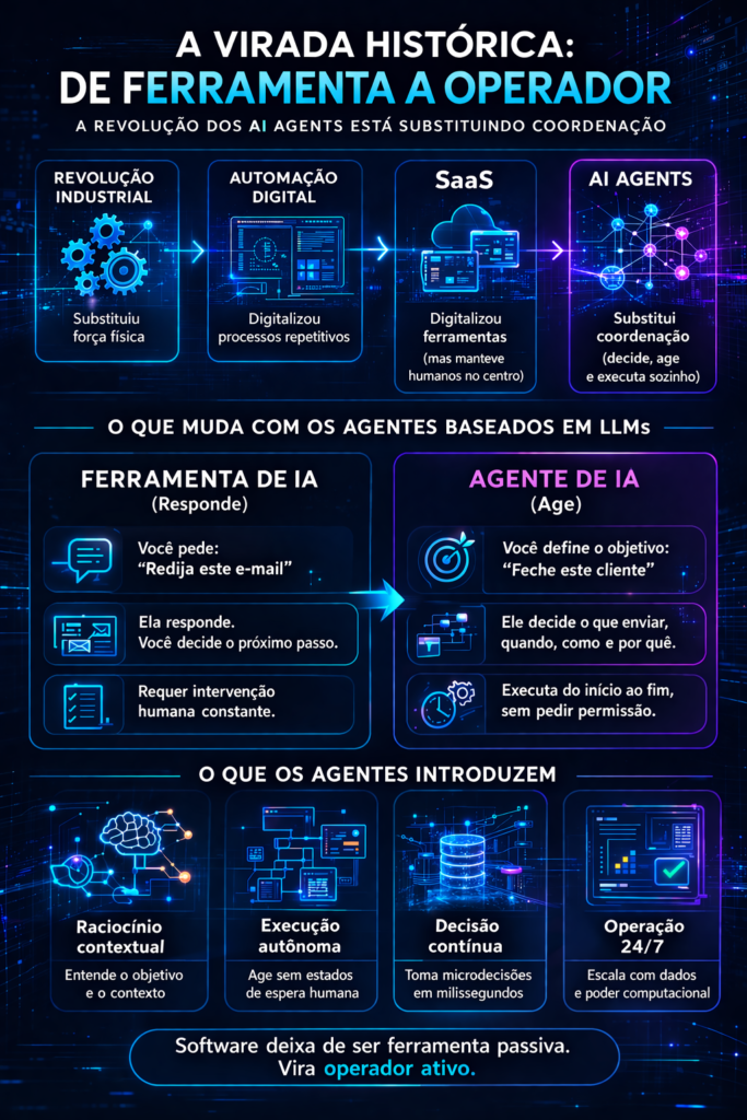 O que os agentes baseados em LLMs introduzem é qualitativamente diferente: raciocínio contextual combinado com capacidade de execução autônoma.