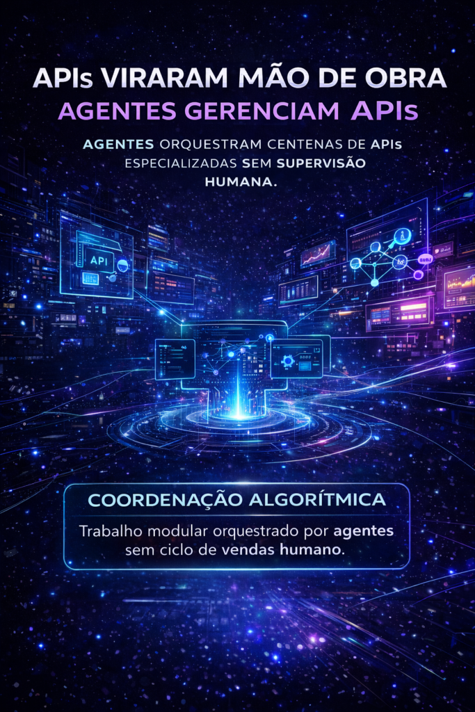 APIs são mão de obra modularizada. Agentes são os gestores dessa mão de obra. A empresa do futuro pode ser, literalmente, um agente central orquestrando centenas de APIs especializadas — cada uma fazendo uma coisa muito bem, sendo paga por uso, sem overhead burocrático.