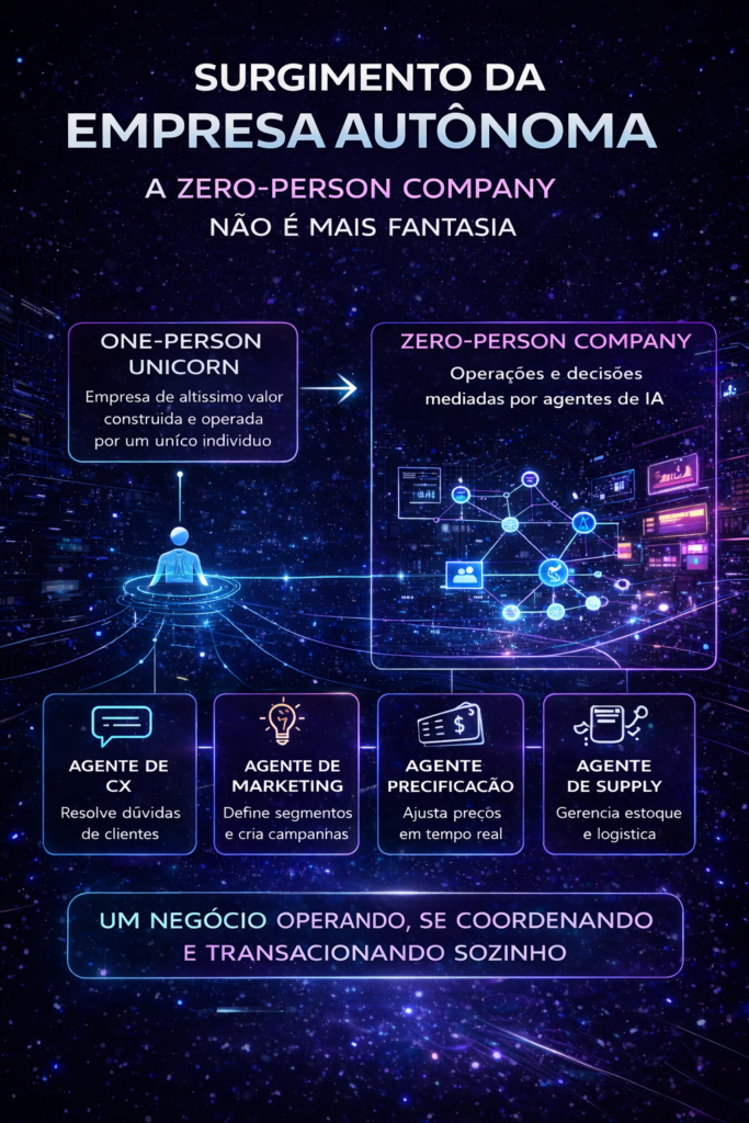 O “one-person unicorn” — empresa de altíssimo valor construída e operada por um único indivíduo — foi por muito tempo visto como fantasia de Silicon Valley. Com agentes autônomos, ele se torna possibilidade estrutural. E além dele, emerge um conceito ainda mais radical: a zero-person company.