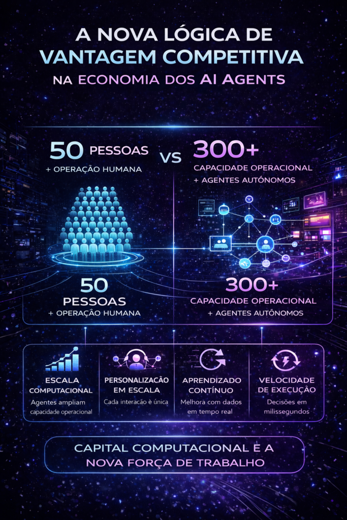 Uma empresa baseada em agentes escala aumentando poder computacional. Aprende com cada interação, em tempo real. Toma decisões em milissegundos. Executa 24 horas por dia. Seus limites são de objetivo, de dado e de arquitetura — não de hora ou de folha de pagamento.