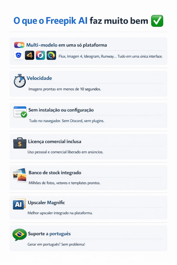 → Multi-modelo em uma só plataforma Nenhuma outra ferramenta reúne Flux, Google Imagen 4, Ideogram, Runway, Kling e Seedream em uma única interface. Você não precisa de conta em cada ferramenta — o Freepik faz a curadoria por você.